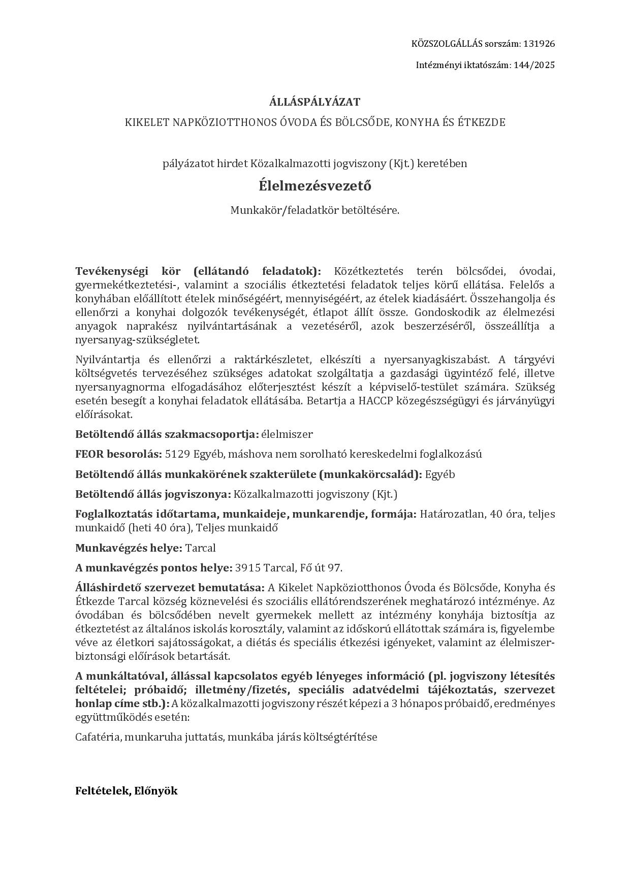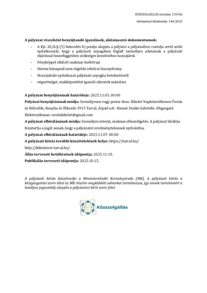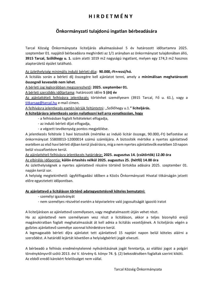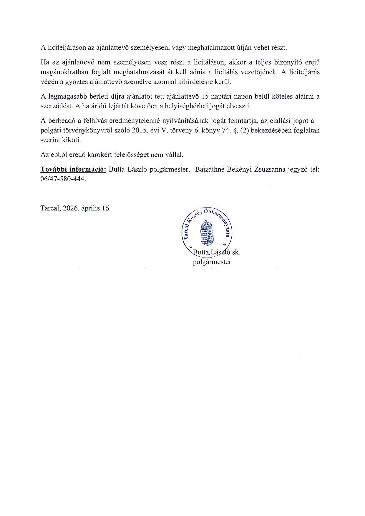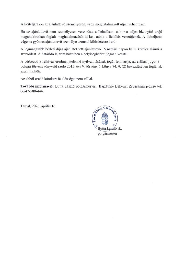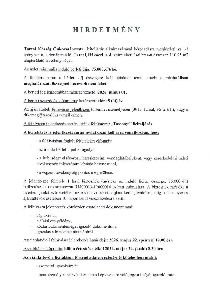 TARCAL HÍREI, ÖNKORMÁNYZATI FELHÍVÁSOK